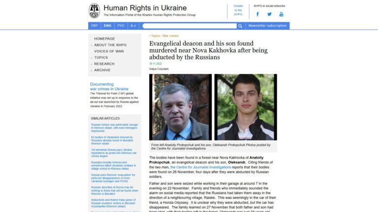 The bodies have been found in a forest near Nova Kakhovka of Anatoliy Prokopchuk, an evangelical deacon and his son, Oleksandr. Citing friends of the two men, the Centre for Journalist Investigations reports that their bodies were found on 26 November, four days after they were abducted by Russian soldiers.
